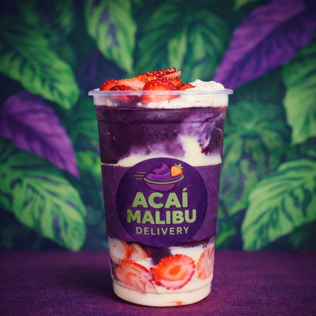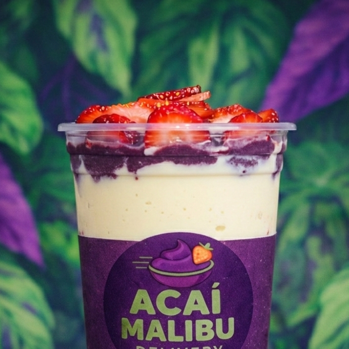 Delicioso açaí premium e cremoso de 700ml com três camadas de recheio e 2 complementos gratuitos. Observação: - A montagem do copo segue uma ordem e uma quantidade pré-determinada à loja. - Não enviamos complementos separados. - Imagem ilustrativa.