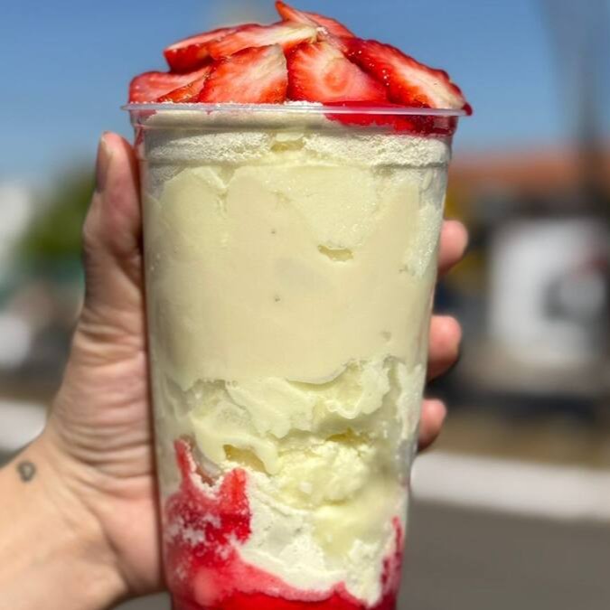 Olha só a nossa idéia: Sorvete de Ninho gelado e super cremoso, com nosso recheio de creme de Ninho que derrete na boca, com leite em pó, muitos morangos e pra finalizar, uma cobertura de morango irresistível por cima!! É doce, é suave, é Irresistível!