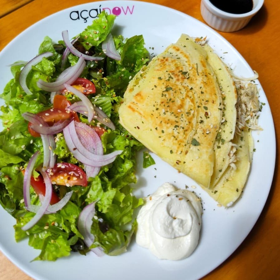 Deliciosa Crepioca com salada - mix de folhas, tomate cereja, cebola roxa, cebolinha e cream cheese.