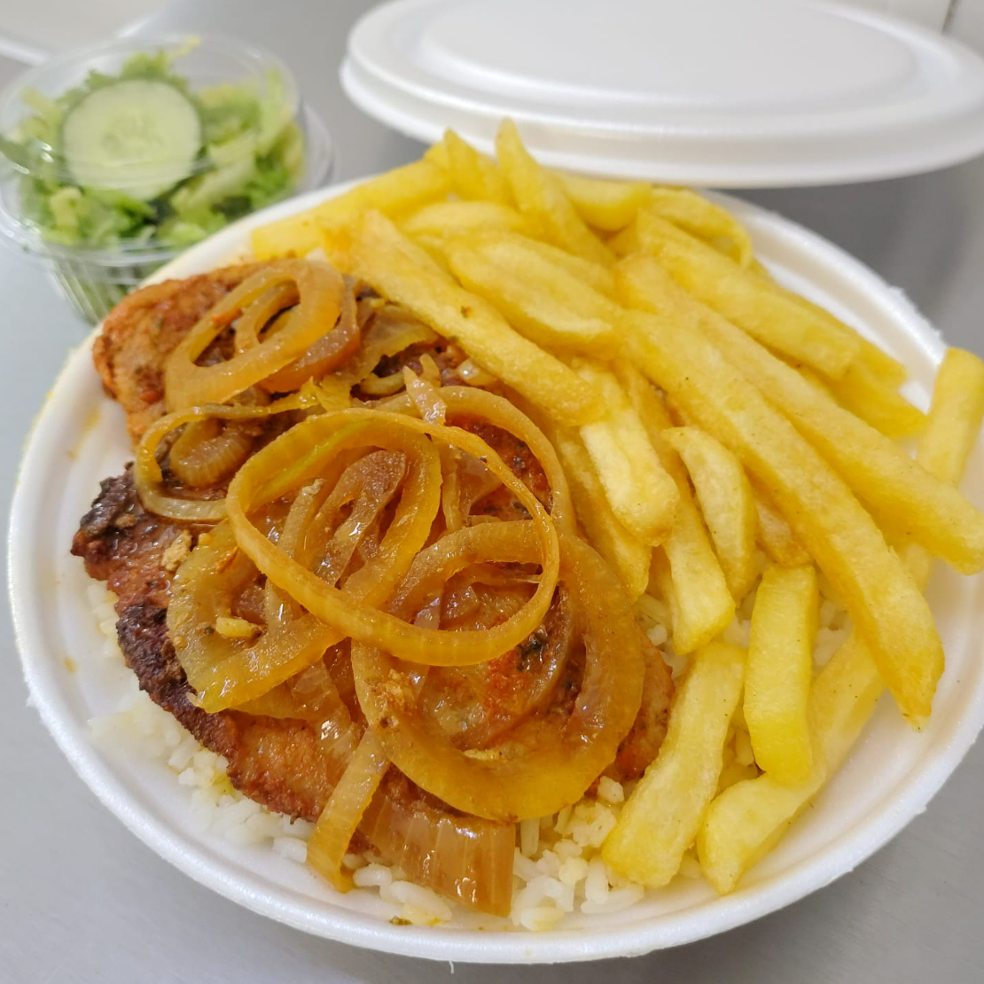 Bisteca de porco, acompanha arroz e feijão e mais dois acompanhamentos a sua escolha
