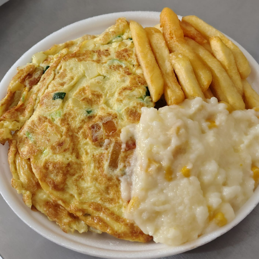 Omelete, acompanha arroz e feijão e mais dois acompanhamentos a sua escolha