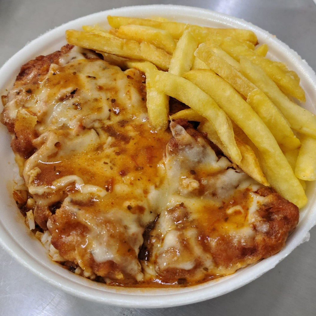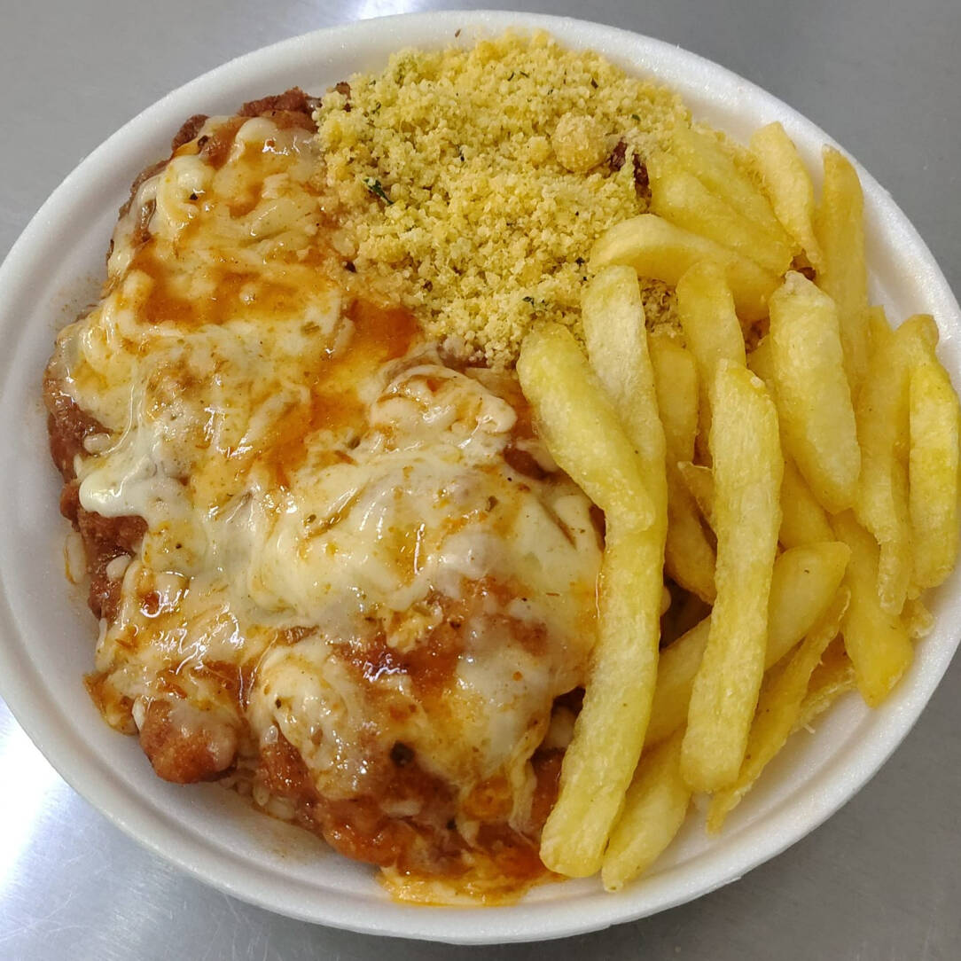 Parmegiana de frango, acompanha arroz e feijão e mais dois acompanhamentos a sua escolha