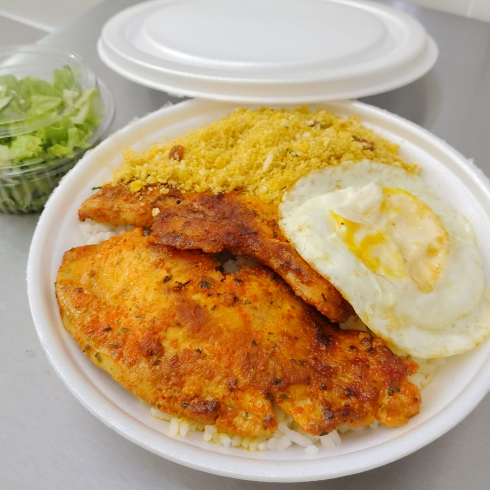 Filé de frango, acompanha arroz e feijão e mais dois acompanhamentos a sua escolha