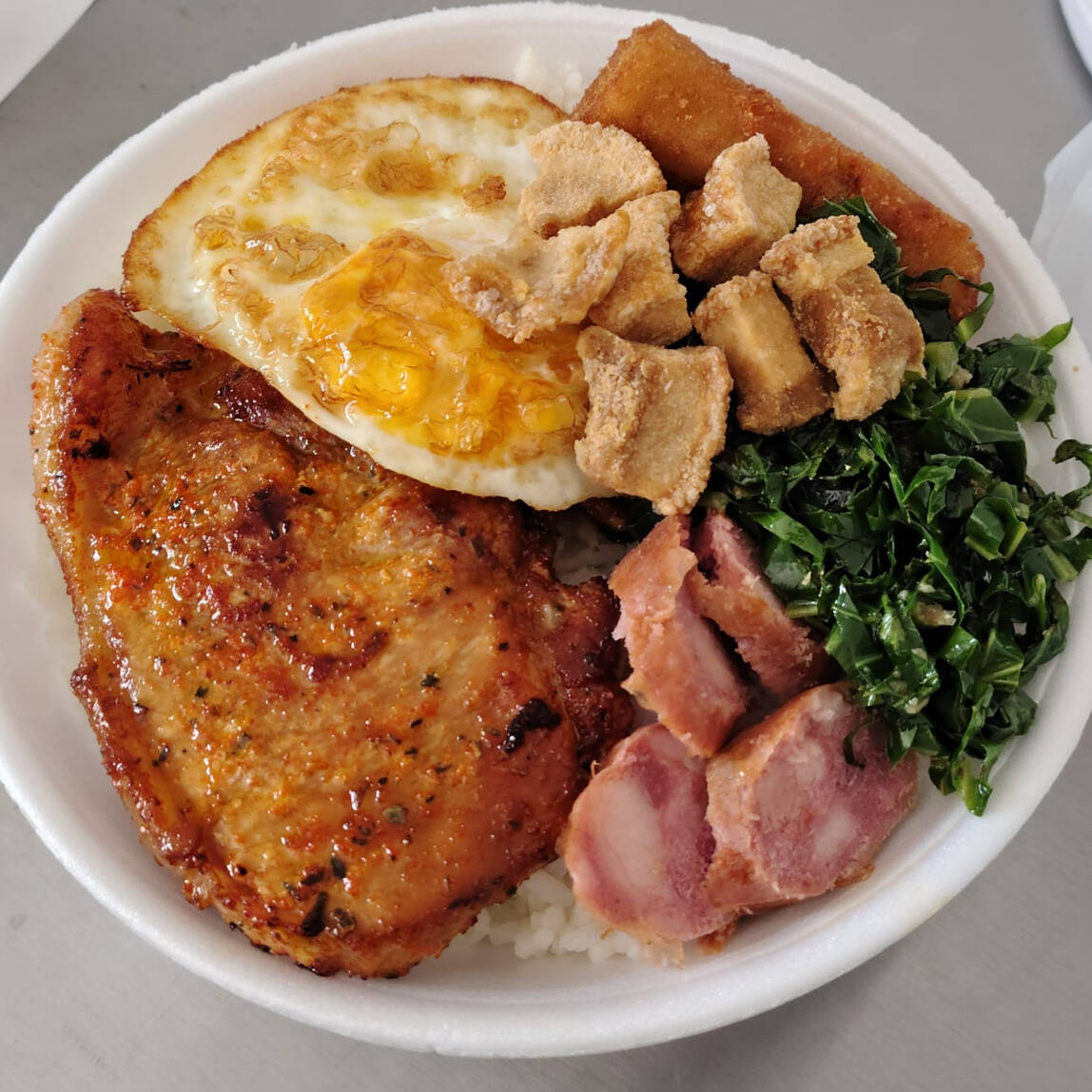 O virado a paulista acompanha, o arroz, tutu de feijão, bisteca suína grelhada, ovo frito, linguiça, couve refogada, torresmo e banana a milanesa.