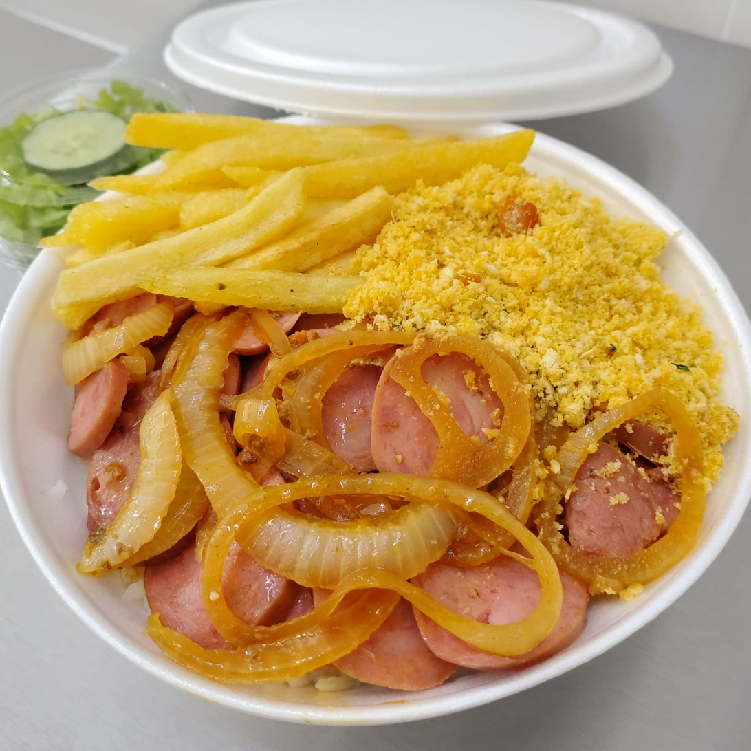 Calabresa grelhada ou acebolada, acompanha arroz e feijão e mais dois acompanhamentos a sua escolha.