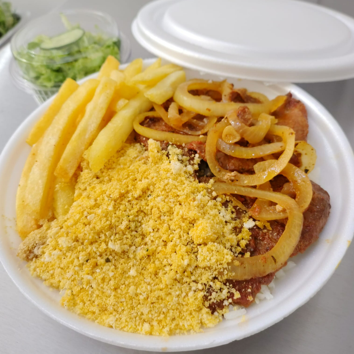 Bife , acompanha arroz e feijão e mais dois acompanhamentos a sua escolha
