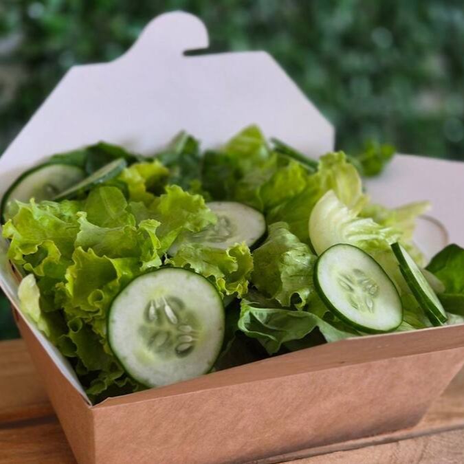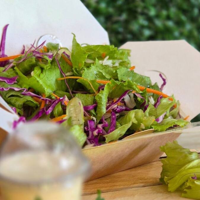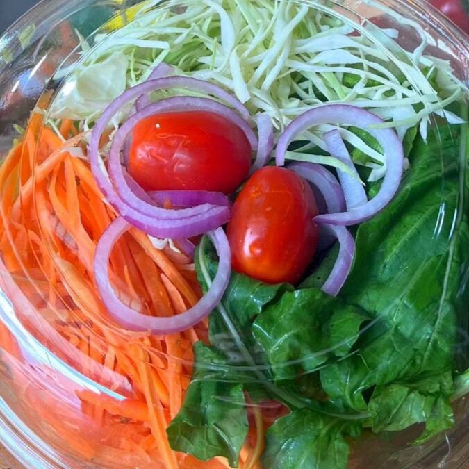 - Alface americana, cenoura ralada, repolho roxo ralado, pedaços de nachos crocantes e molho ranch.