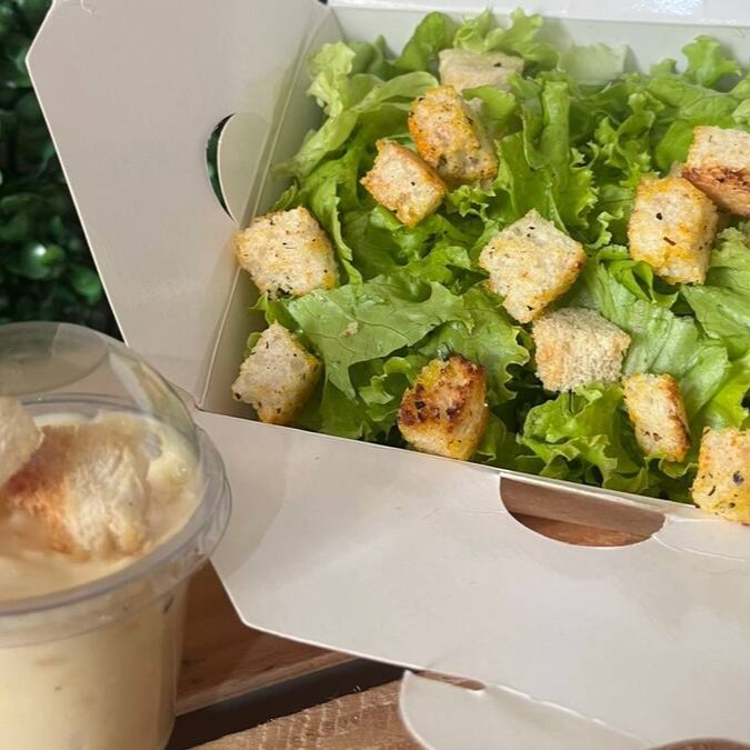 Alface americana, queijo parmesão ralado, croutons e molho caesar.