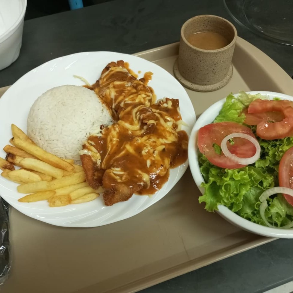 Marmita media executiva de parmegiana de carne acompanha arroz , fritas , salada de alface e tomate