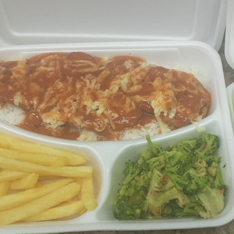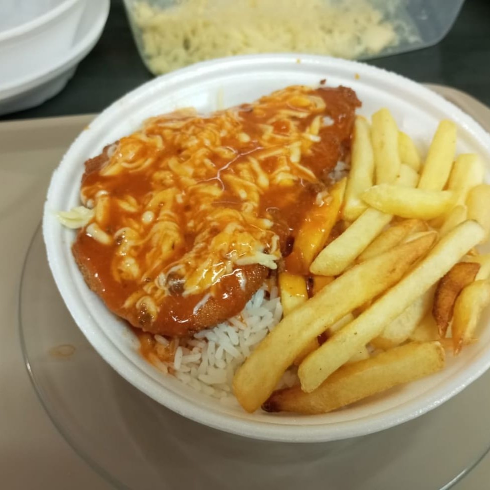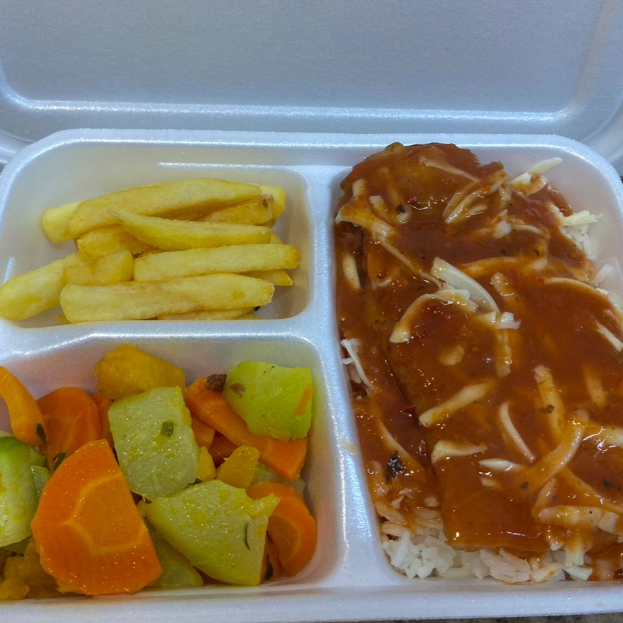 MARMITA EXECUTIVA MINI PARMEGIANA DE FRANGO ACOMPANHA ARROZ FRITAS E LEGUMES