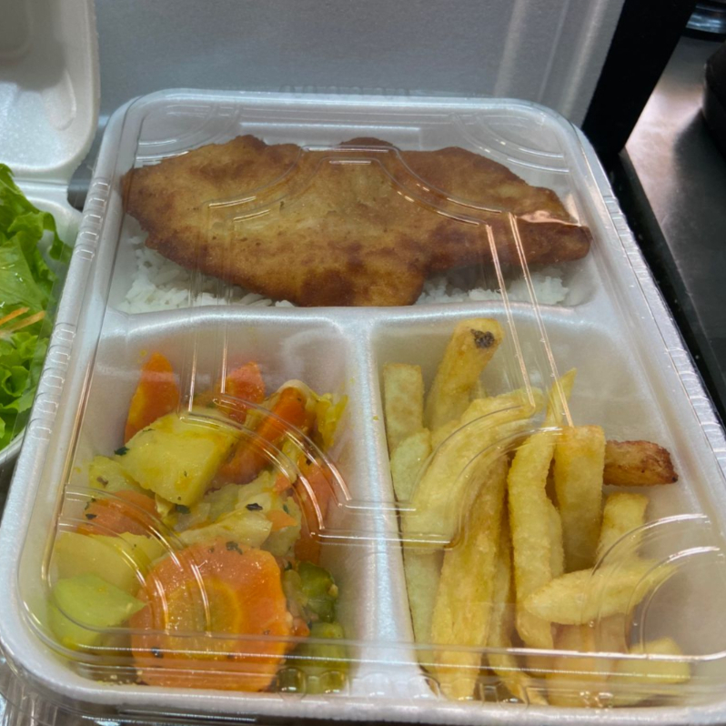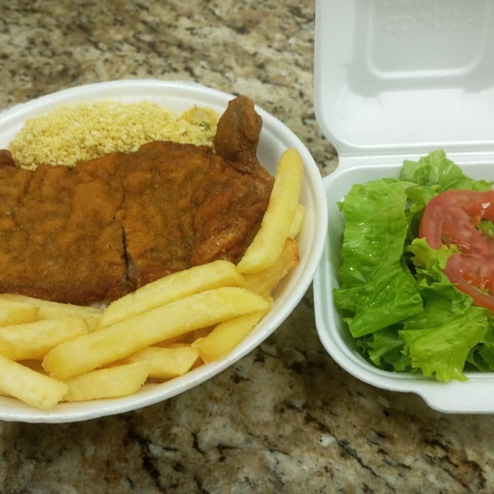 Executiva Media De Bife A Milanesa Acompanhado De Arroz, Feijão , Fritas E Salada Do Dia .