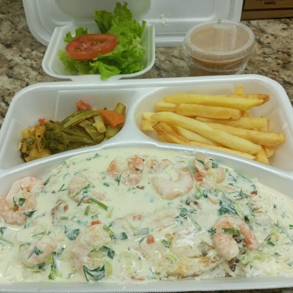 File De Tilapia Ao Molho Com Camarão Executiva Media Serve Uma Pessoa Acompanha Arroz , Batata frita , Salada Do Dia e Legumes do Dia.