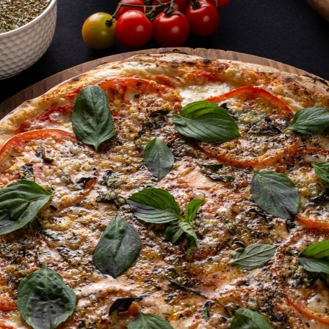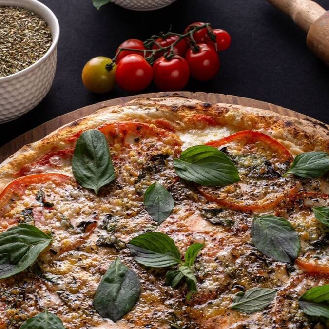 Molho de tomate, mussarela, tomate caqui, manjericão, parmesão e orégano ao forno finalizada com manjericão fresco.