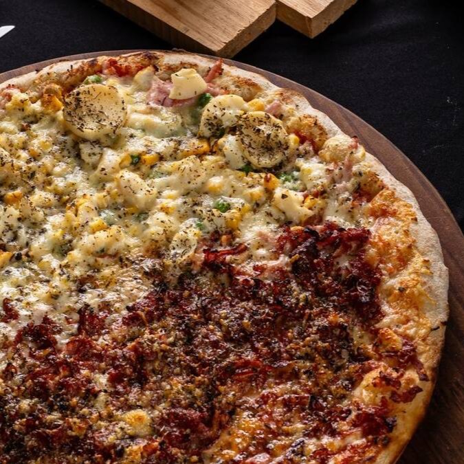 Calabresa, cebola, mussarela, bacon, ovo, molho de tomate, parmesão, orégano e borda de Catupiry