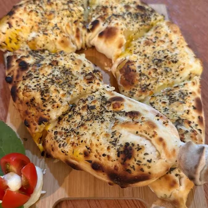 Mussarela , gorgonzola ,cheddar , Catupiry (massa: azeite, parmesão e orégano)