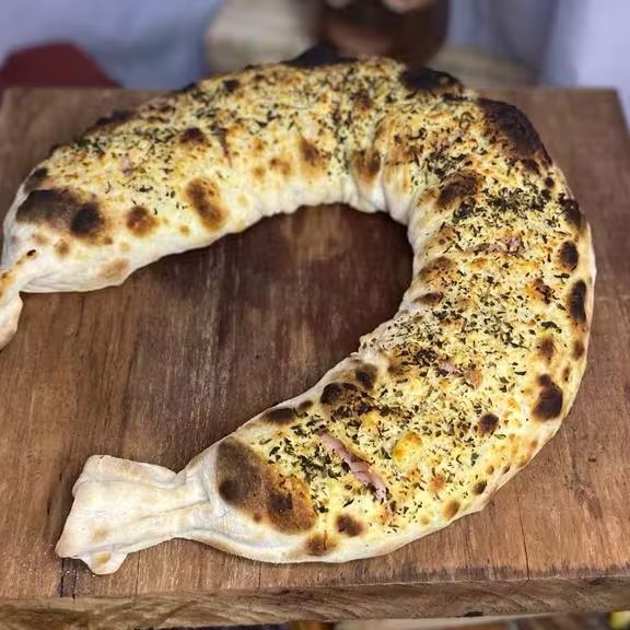 Presunto , azeitonas verdes picadas ,mussarela (massa: azeite, parmesão e orégano)
