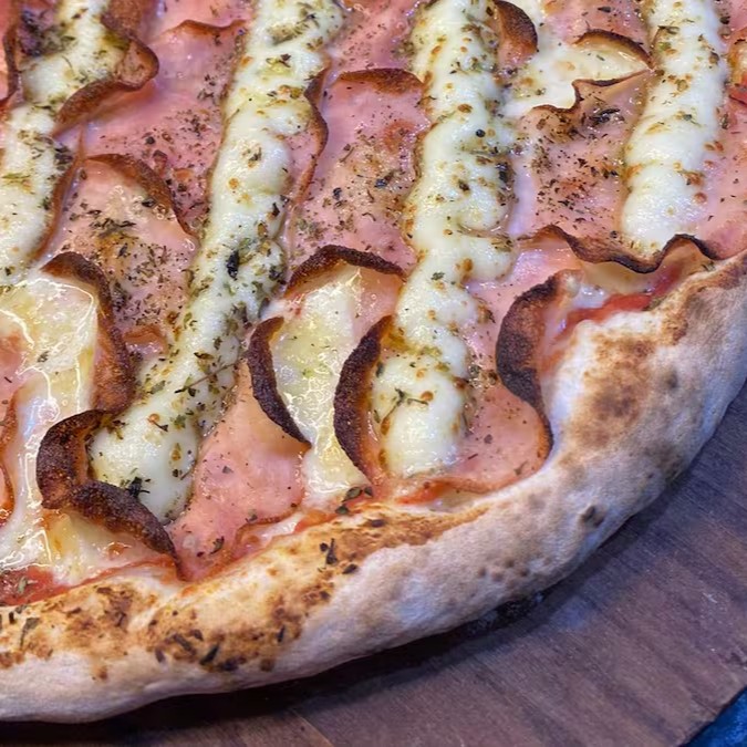 Molho de tomate, mussarela, lombo canadense, Catupiry e orégano ao forno.