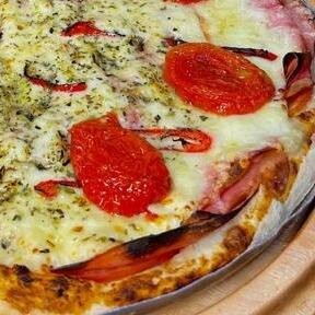 Speciale della casa : molho de tomate, tomate em rodelas, mortadela perdigão ouro, Catupiry, mussarela, pimenta dedo de moça e orégano, finalizada com tomate seco.