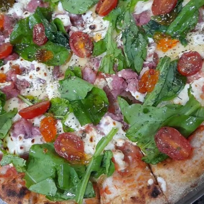 Molho artesanal, mussarela, linguiça toscana artesanal, cream cheese, tomate cereja, geleia de pimenta, rucula, azeitonas, oregano.