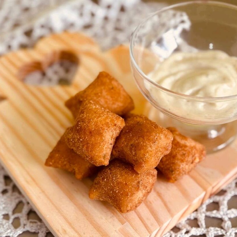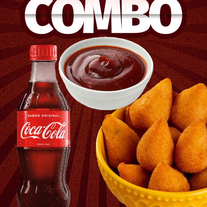 Coxinhas crocantes e sequinhas com molho barbecue, e uma coca cola 200 ml