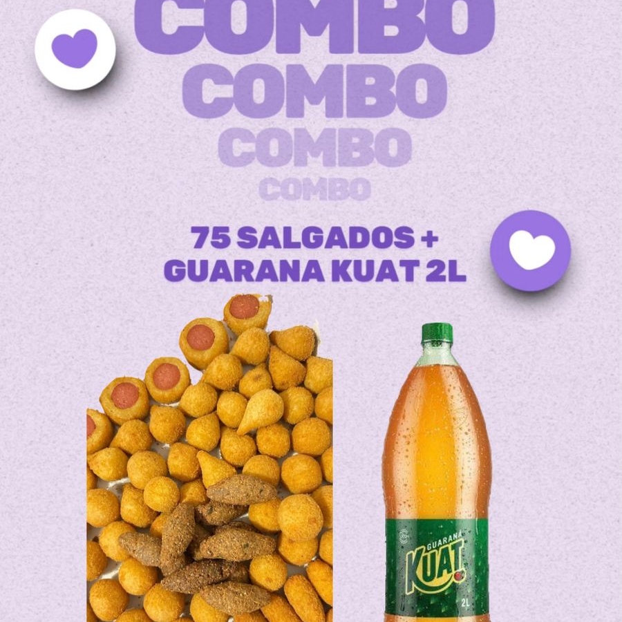 75 salgados mistos crocantes e 1 Guaraná Kuat 2l geladinho, (salgados mistos:(queijo, presunto e queijo, coxinha, kibe, croquete, salsicha) Faça seu pedido!!
