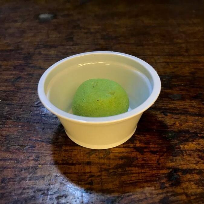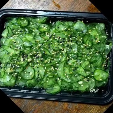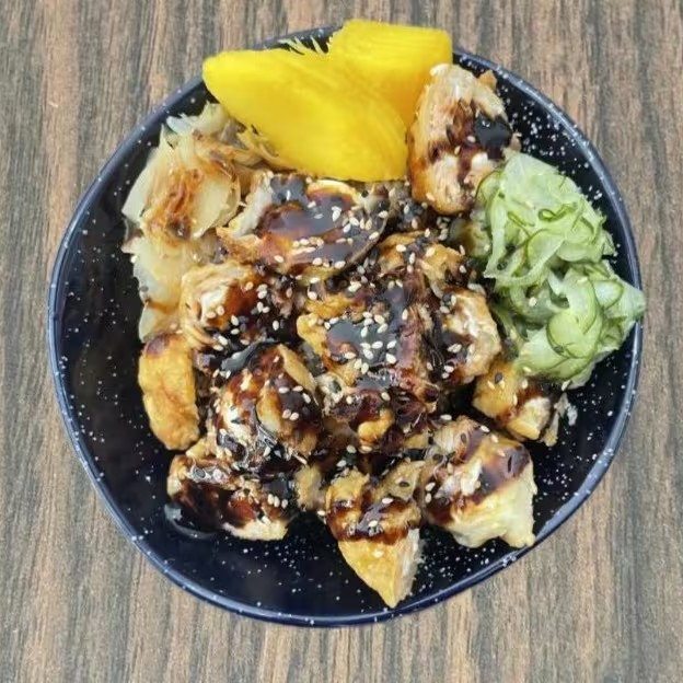 Meio poke de bolinho de chuva, sunomono, manga, gengibre, gergelim e arroz.