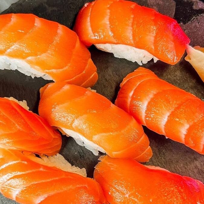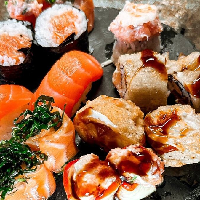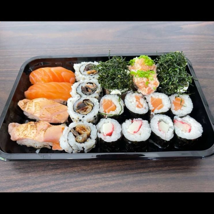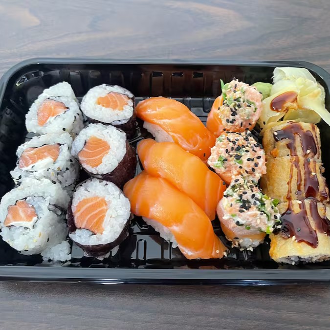 3 uramakis de salmão, 3 hossomakis de salmão, 3 niguiris de salmão, 3 joys de samão e 3 hot rolls