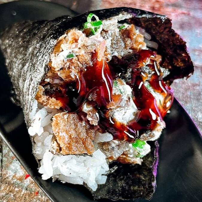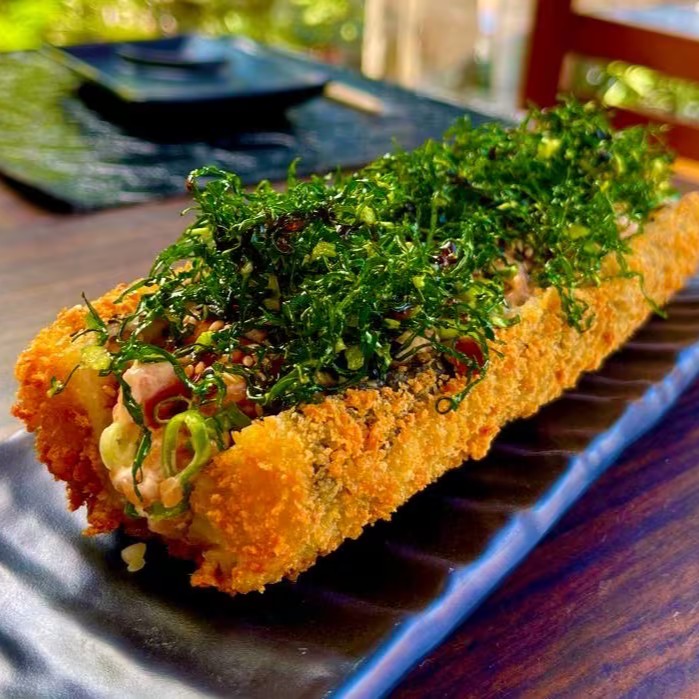 Arroz e alga empanados em farinha panko com recheio de salmão, cream cheese, cebolinha e couve crispy