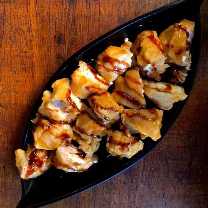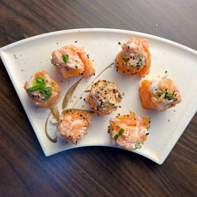 8 unidades de bolinhos de salmão recheados com cream cheese com um toque suave de Tarê e Calda de Laranja . Irresistível !!!