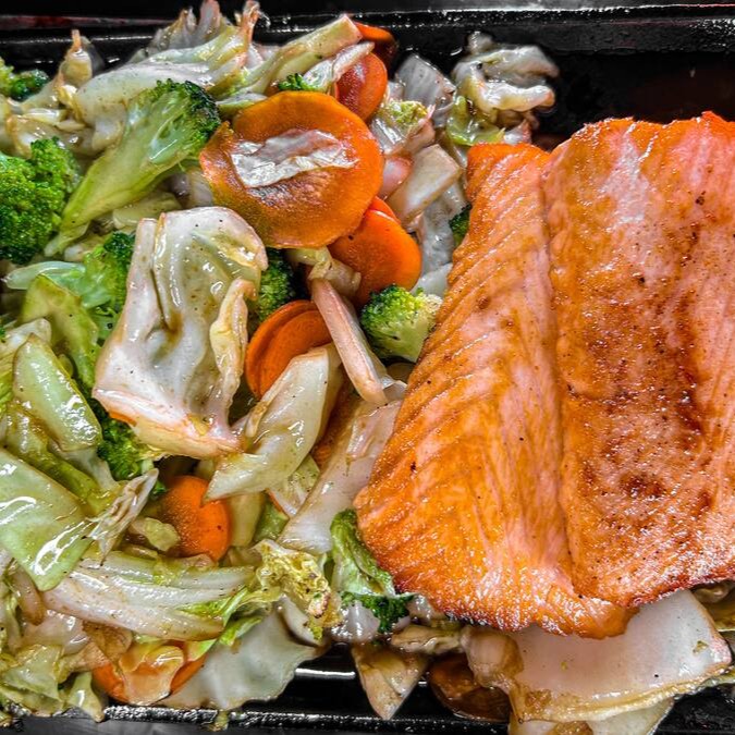 Legumes refogados na manteiga acompanhados de salmão, carne ou frango