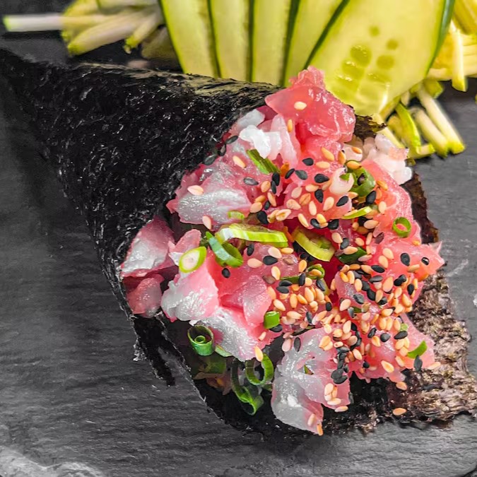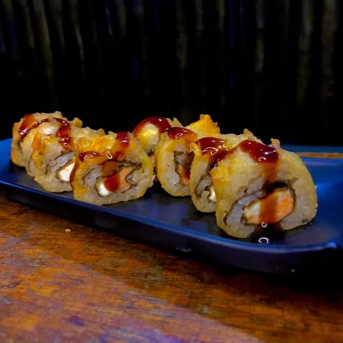 O Uramaki Skin é uma harmoniosa mistura de tradição e modernidade. Composto por 8 unidades, esse sushi exibe um exterior de arroz cuidadosamente moldado e envolto em uma fina camada de alga nori. Seu interior é acentuado com arroz branco perfeitamente cozido, mas o toque final é o que realmente se destaca. A pele de salmão, grelhada ao ponto de uma crocância perfeita que ressalta seu sabor rico e suave, transforma cada unidade do Uramaki Skin em uma experiência gastronômica única. Um prato indispensável para os amantes da culinária japonesa.