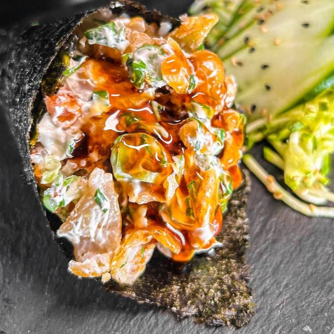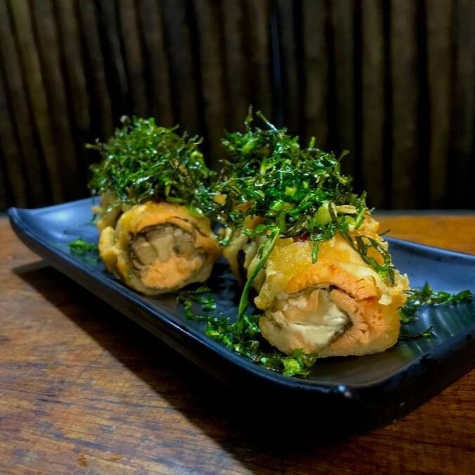 Porção de hot roll de salmão e shimeji coberto com couve crispy