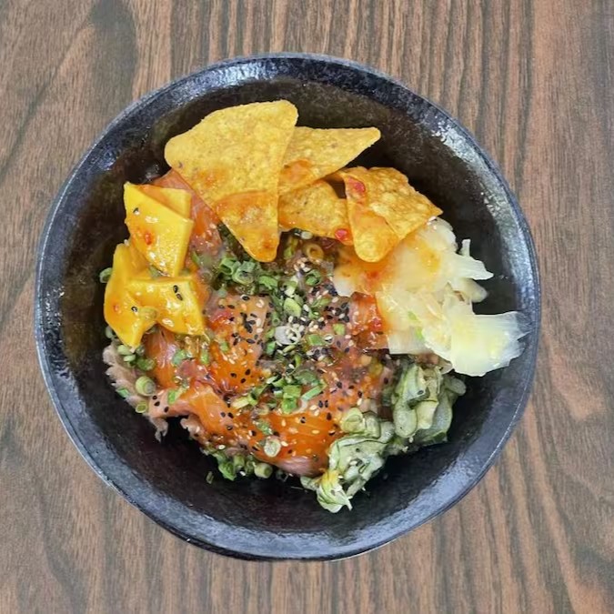 Salmão, manga, sunomono, Doritos, gengibre, gergelim, geleia de pimenta, cebolinha e arroz.