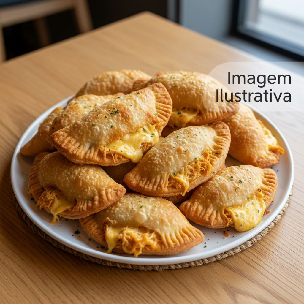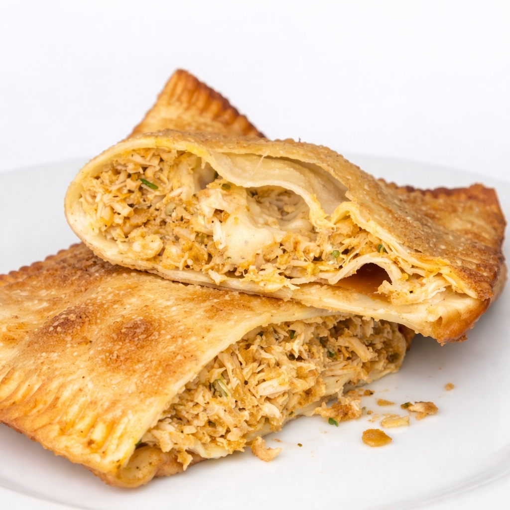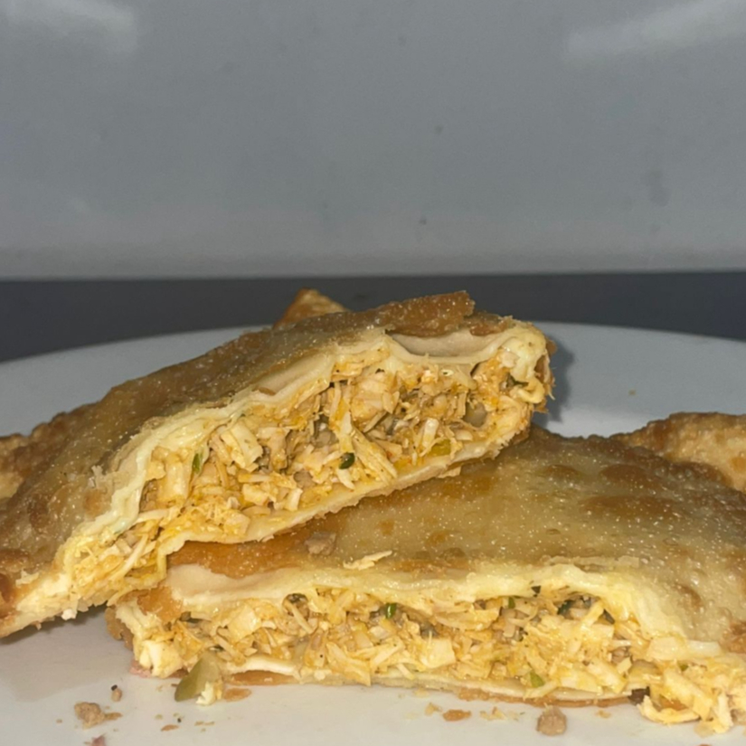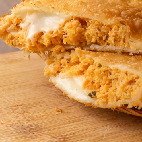 Pastel crocante com recheio de frango temperado e queijo derretido.