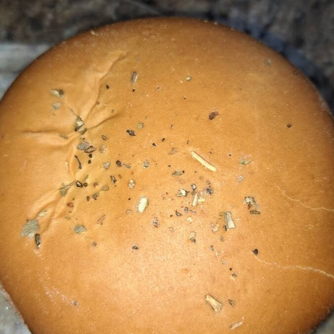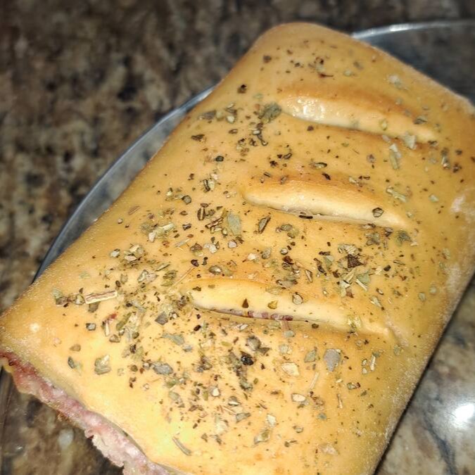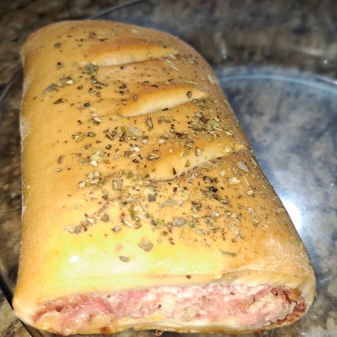 Massa de farinha de trigo, presunto e queijo, orégano e deliciosos temperos caseiros.