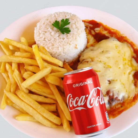 Arroz Branco, Suculentos Filés de Frango à Parmegiana acompanhado de Batata Frita e uma Coca-Cola 350ml