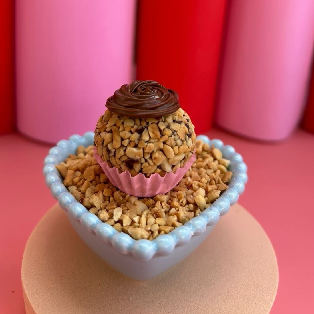 Esse brigadeiro é simplesmente Sensacional! Pois traz equilíbrio e sabor na medida certa. Nossa massa é produzida com cacau em pó 50% e chocolate meio amargo, e envolto no amendoim triturado, e finalizado com uma linda roseta de Nutella. Peso aproximado 24 gramas.