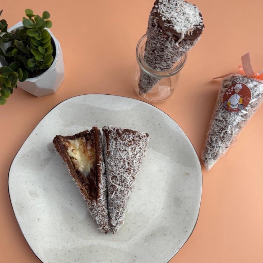 Nosso delicioso Cone Trufado de Prestígio! Com a casquinha banhada no chocolate, e no recheio um irresistível brigadeiro de chocolate e tambem o nosso incrível recheio de beijinho super cremoso. Peso final de 95 gramas.