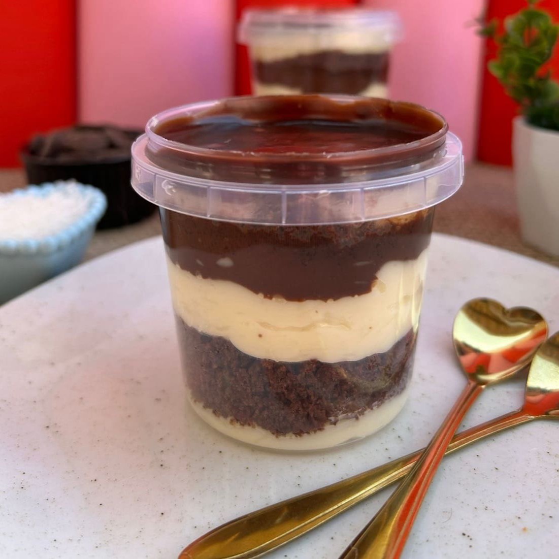 Nosso sensacional bolo no pote de Dois Amores! Com esses dois recheios coringas da confeitaria a doçura em dobro é garantido. Com camadas fofinhas e bem molhadinhas da nossa massa de chocolate, e no recheio bastante creme de Ninho com um delicioso brigadeiro cremoso. Nosso pote é o de 220 ml pesando aproximadamente 180 gramas.
