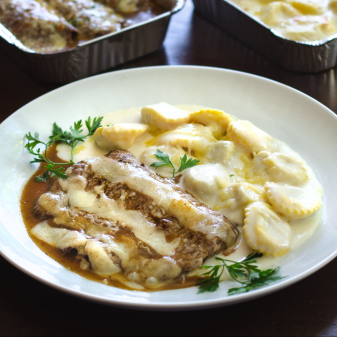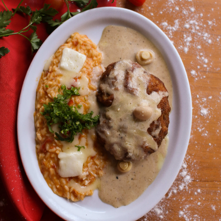 Grelhado, recheado de queijo camembert, molho madeira, guarnecido de marumbini ao molho alfredo