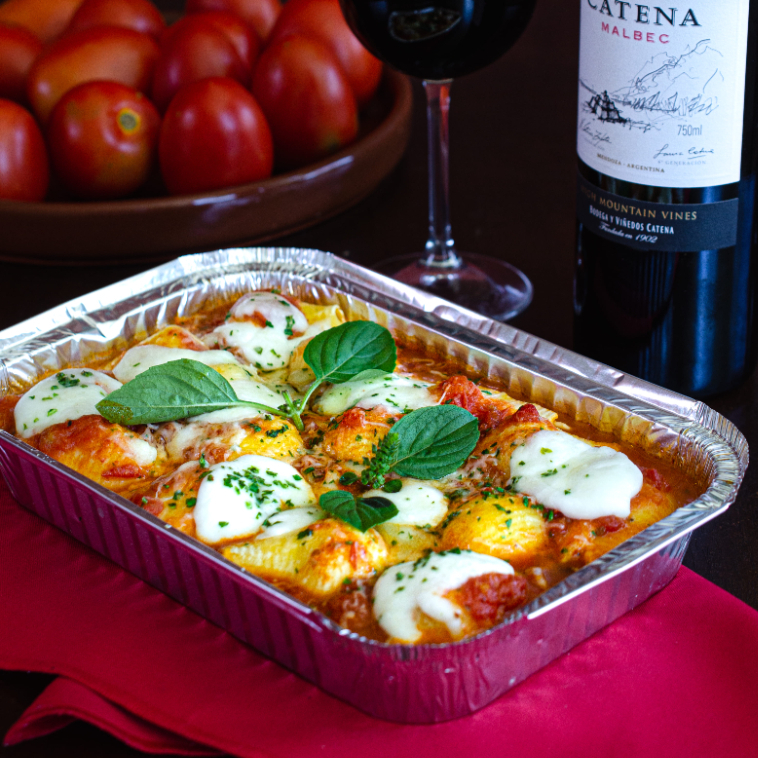 massa recheada com mozzarella, ricota e Catupiry, acompanhada de uma combinação de molho de polpa de pomodori com mozzarella de búfala laminada e manjericão, gratinada com mozzarella e parmesão