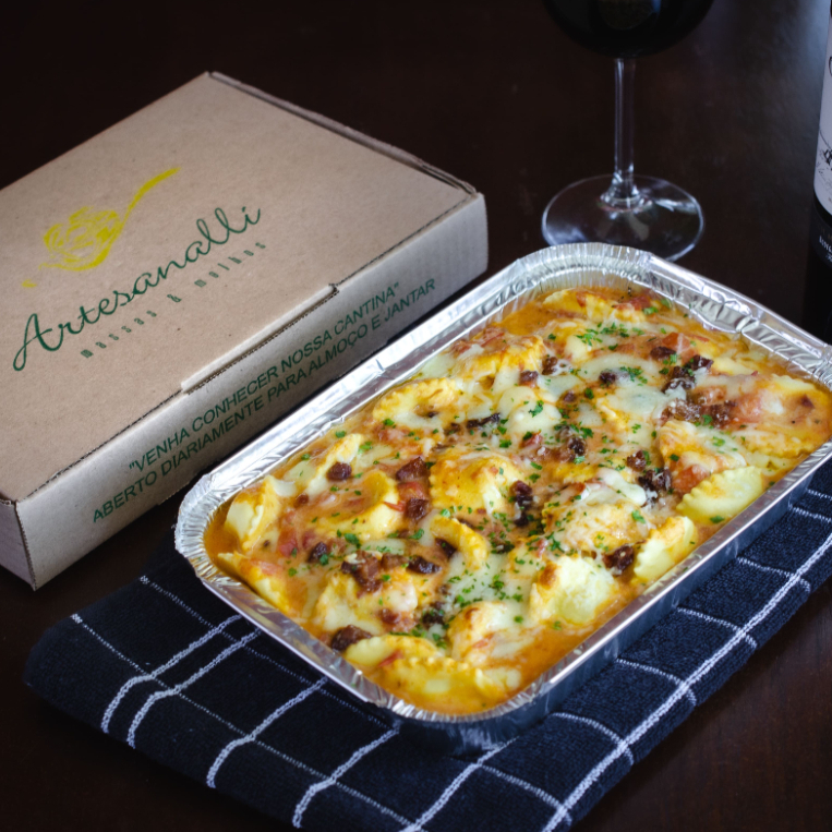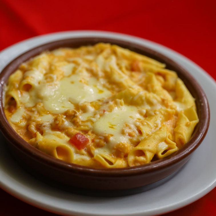 tradicional gnocchi elaborado com batatas, ao molho de polpa de pomodori combinado com molho branco acrescido de manjericão, gratinado com linguiça calabresa, Catupiry, mozzarella e parmesão - Serve 1 pessoa com fartura ou 2 pessoas.