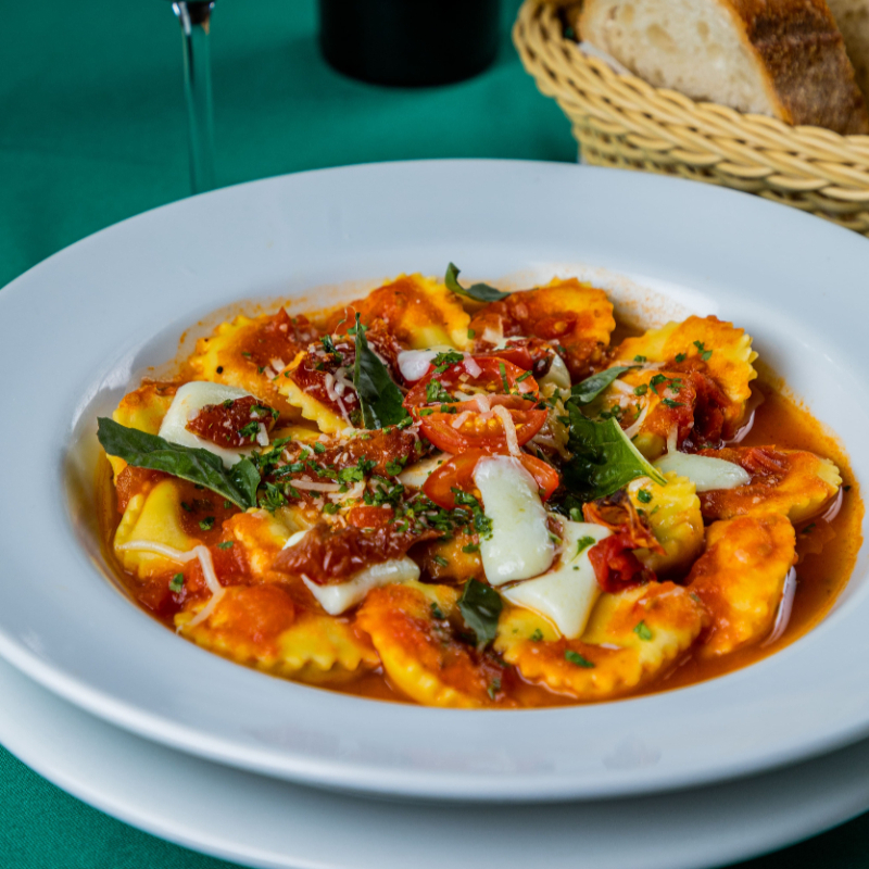 massa recheada com mozzarella de búfala e manjericão. Servida com molho mastroiane