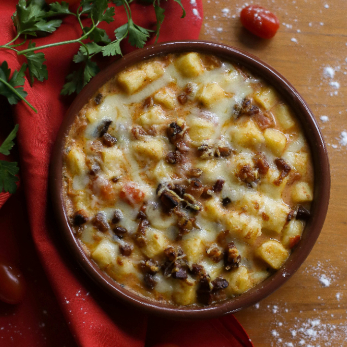 gnocchi recheado com Catupiry, servido ao molho de tomates frescos combinado com molho branco, gratinado com mozzarella e parmesão - Serve 1 pessoa com fartura ou 2 pessoas.