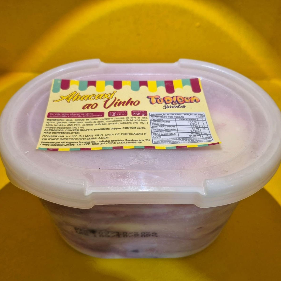 sorvete de pote 1,5 litros de abacaxi ao vinho