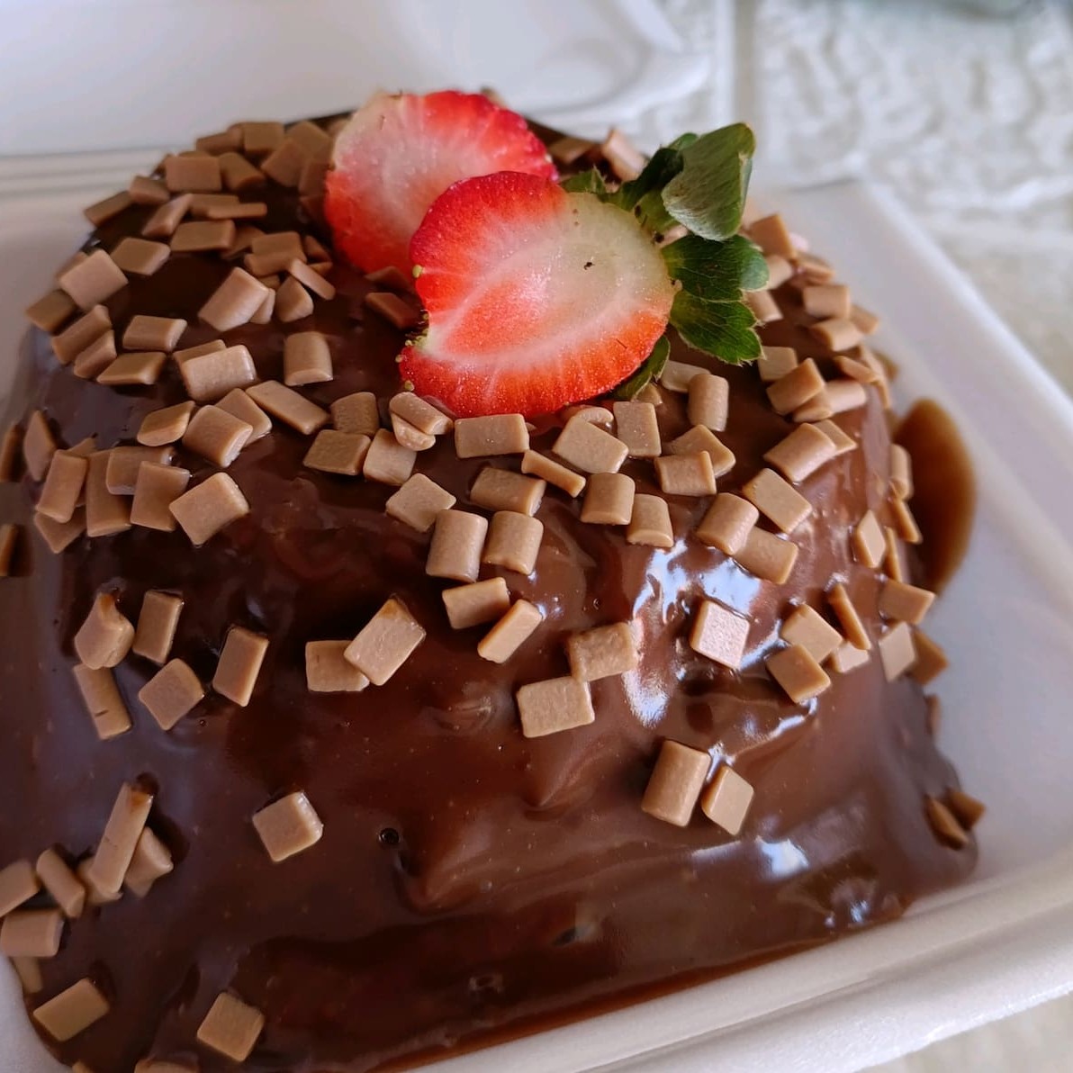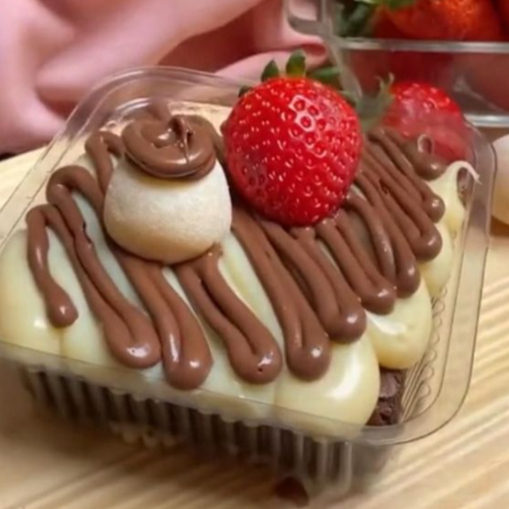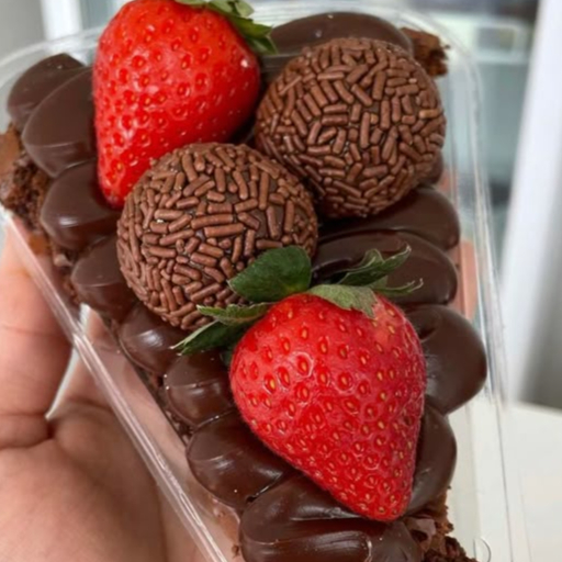 2 camadas generosas de brownie com creme de chocolate e morangos picados no meio