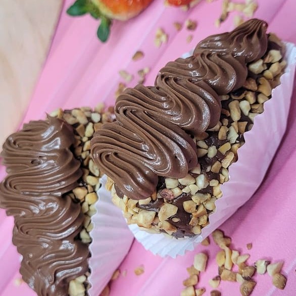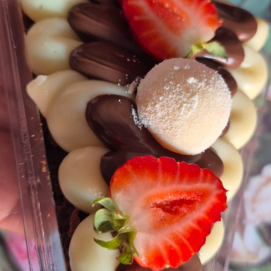 Cestinha banhada chocolate. Creme de ninho brownie. Morangos e creme de avelã