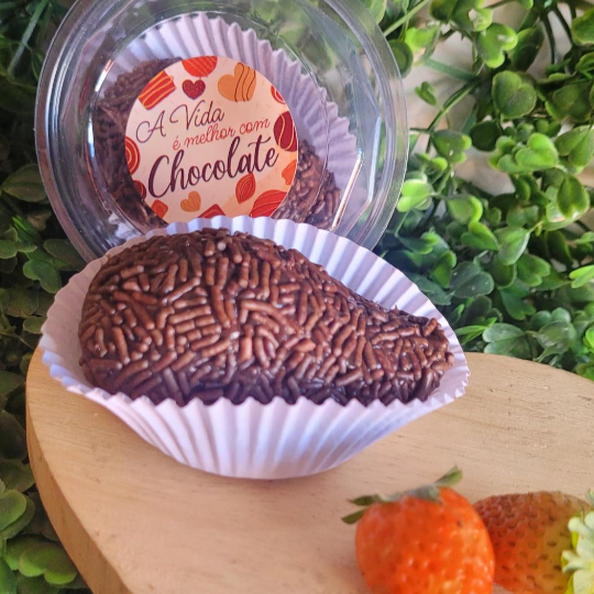 Brigadeiro ao leite cremoso com morangos e amendoim. Finalizada com Nutella
