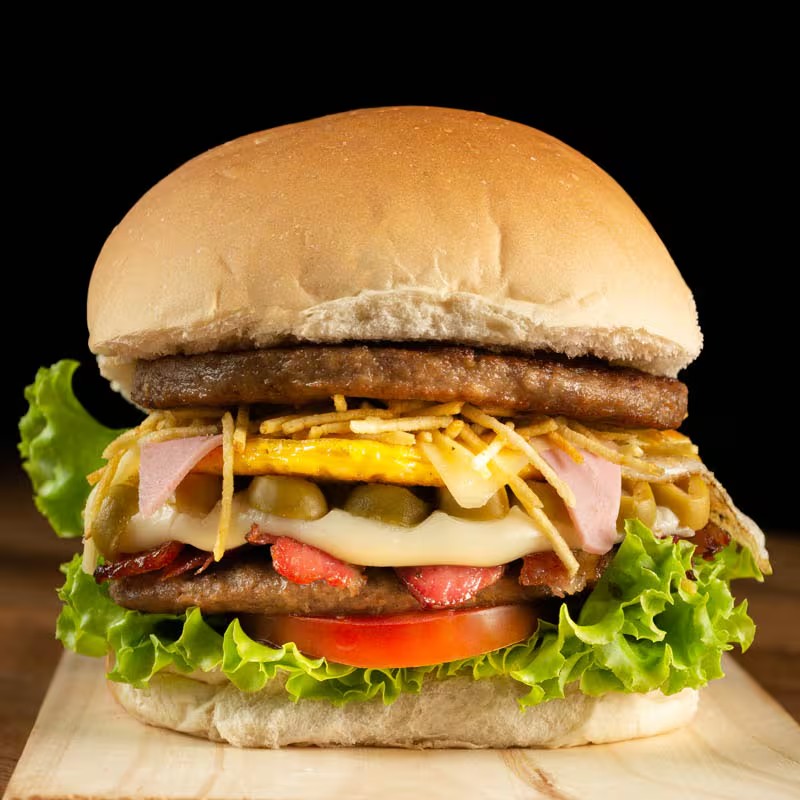 13 - Pão, 2 Hambúrgueres, Queijo, Presunto, Bacon, Ovo, Catupiry, Azeitona, Batata Palha E Salada. Copiar