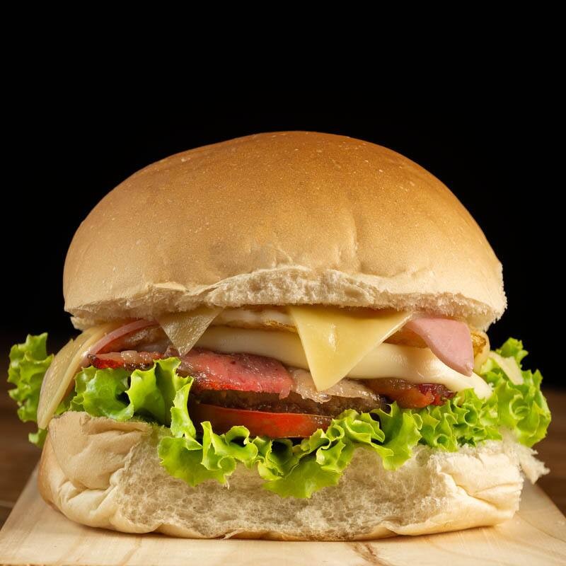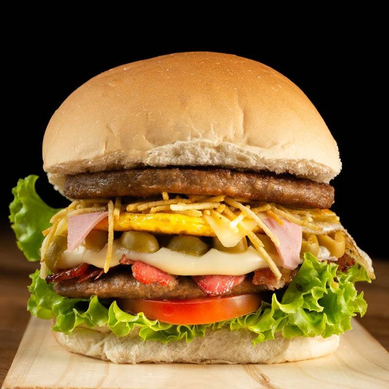 Pão, 2 hambúrgueres, queijo, presunto, bacon, ovo, champignon, picles, milho, ervilha, vinagrete e salada.